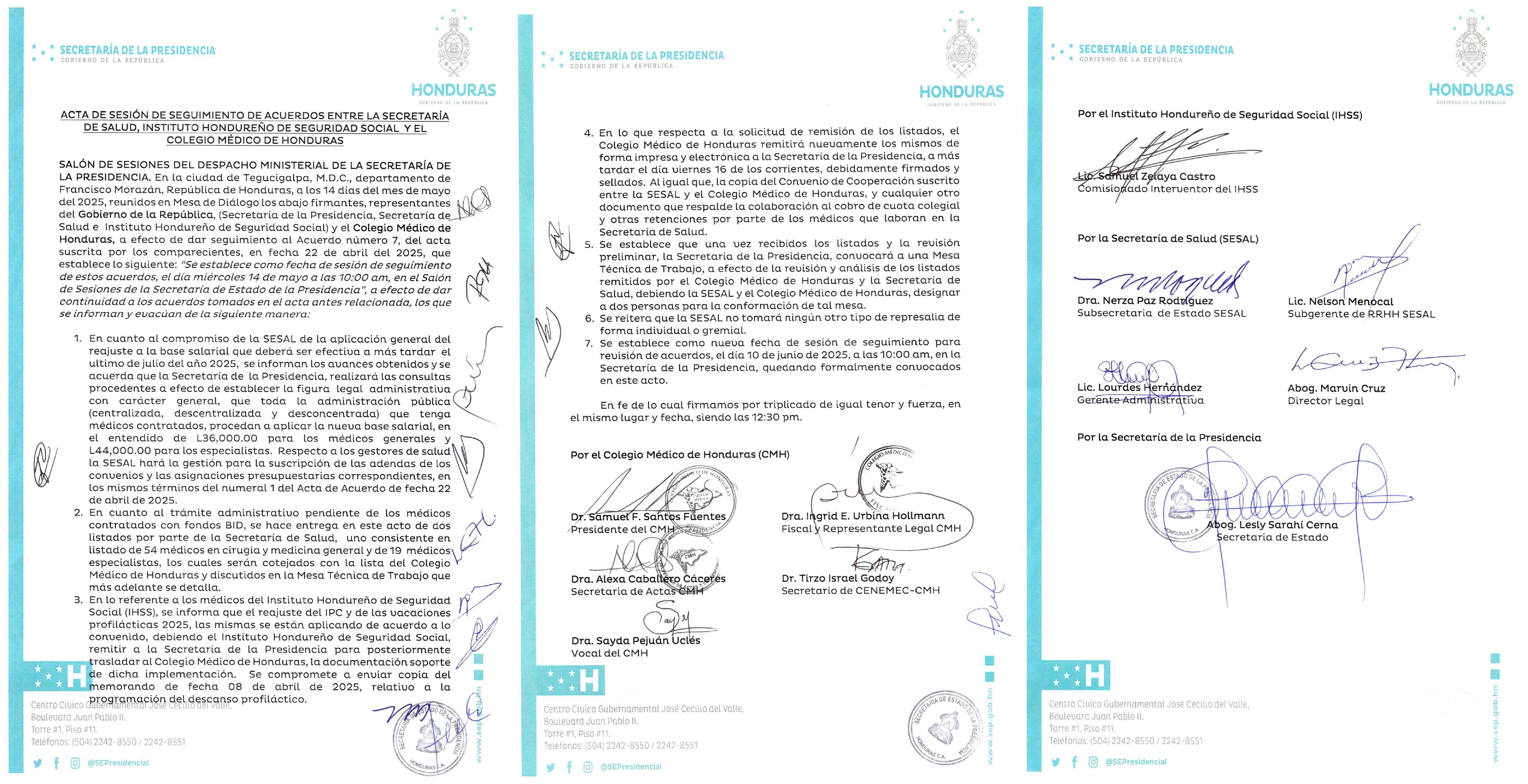 ACTA DE SESIÓN DE SEGUIMIENTO DE ACUERDOS ENTRE LA SECRETARÍA DE SALUD, INSTITUTO HONDUREÑO DE SEGURIDAD SOCIAL Y EL COLEGIO MÉDICO DE HONDURAS