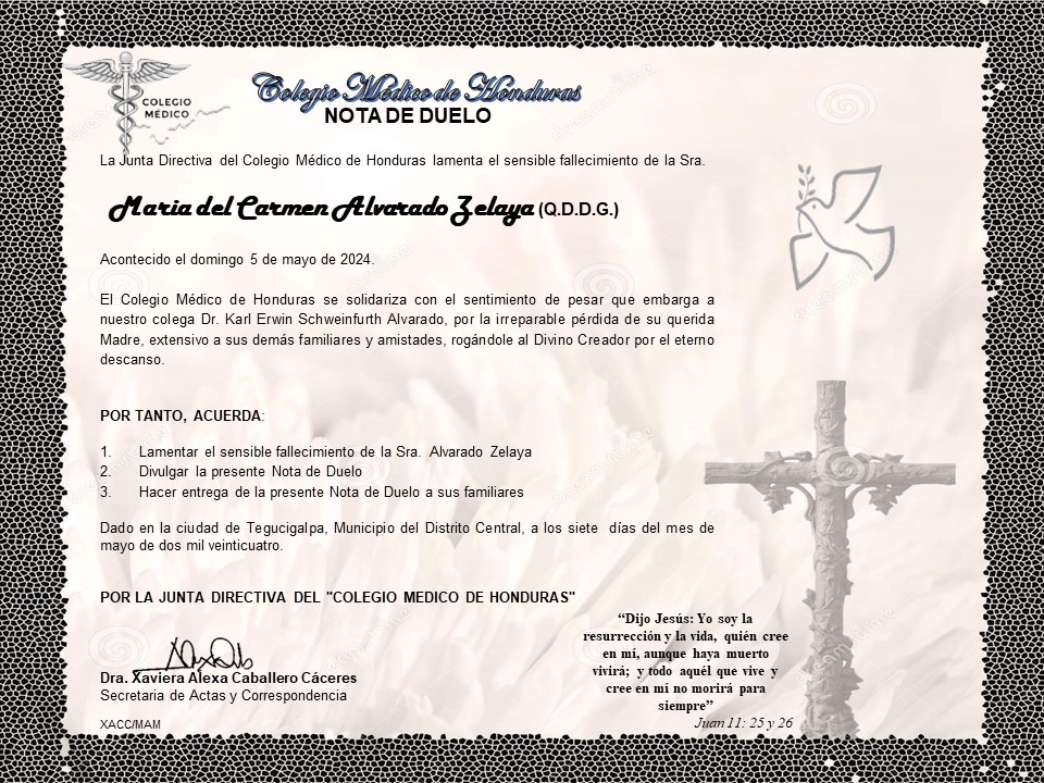 Nota de Duelo de la Señora María del Carmen Alvarado Zelaya (Q.D.D.G.), madre del Dr. Karl Erwin Schweinfurth Alvarado.