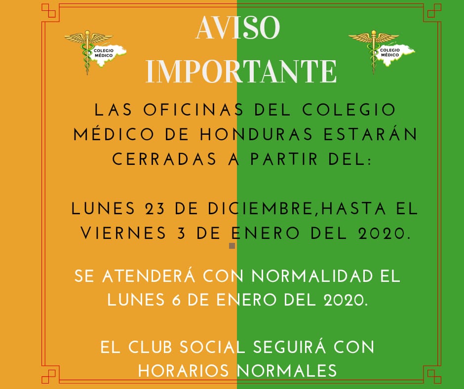 Al gremio del Colegio Médico de Honduras y a la población en general, se les avisa que las oficinas del CMH estarán cerradas a partir del: