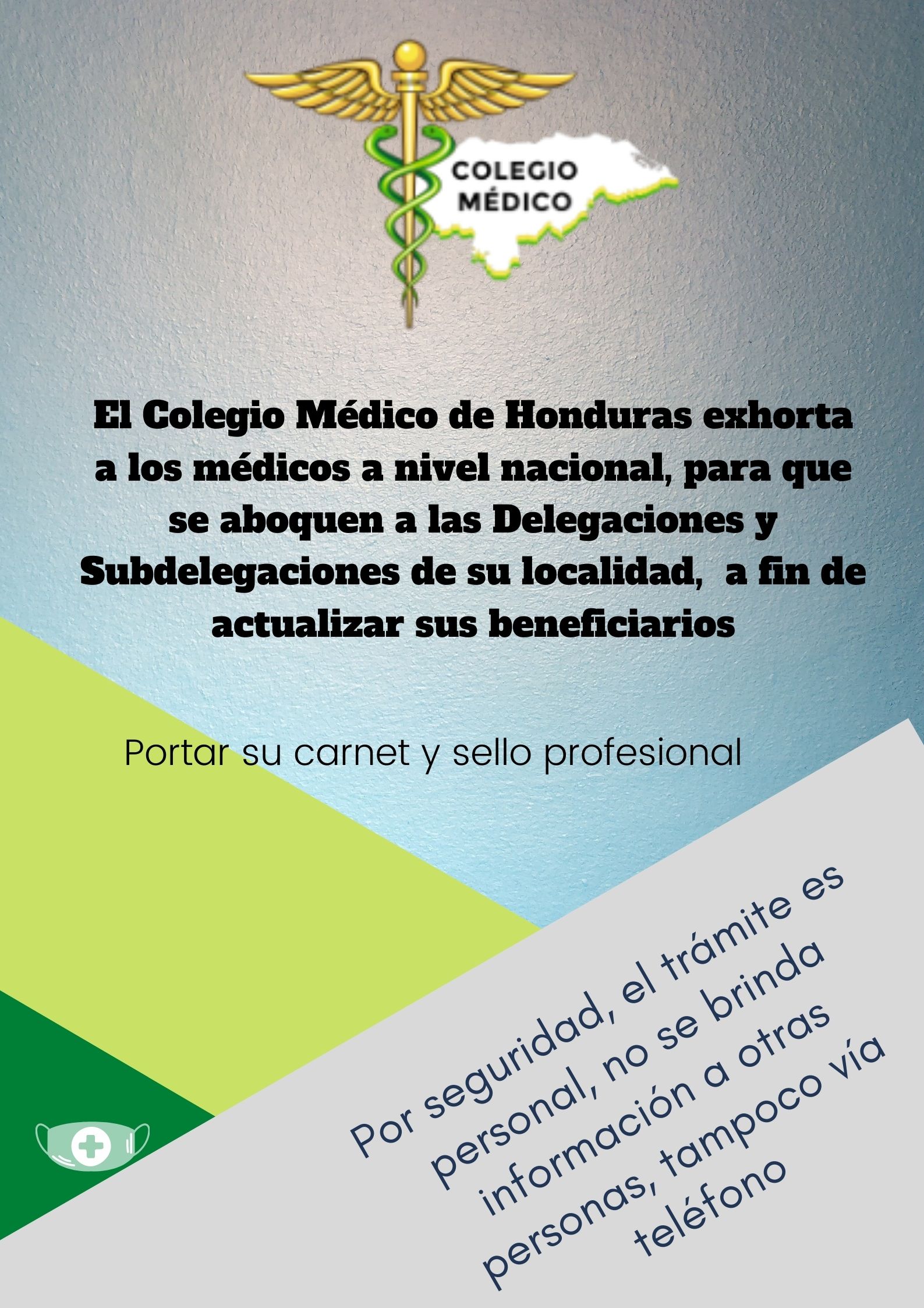 El Colegio Médico de Honduras exhorta a los médicos a nivel nacional, para que se aboquen a las Delegaciones y Subdelegaciones de su localidad, a fin de actualizar sus beneficiarios.