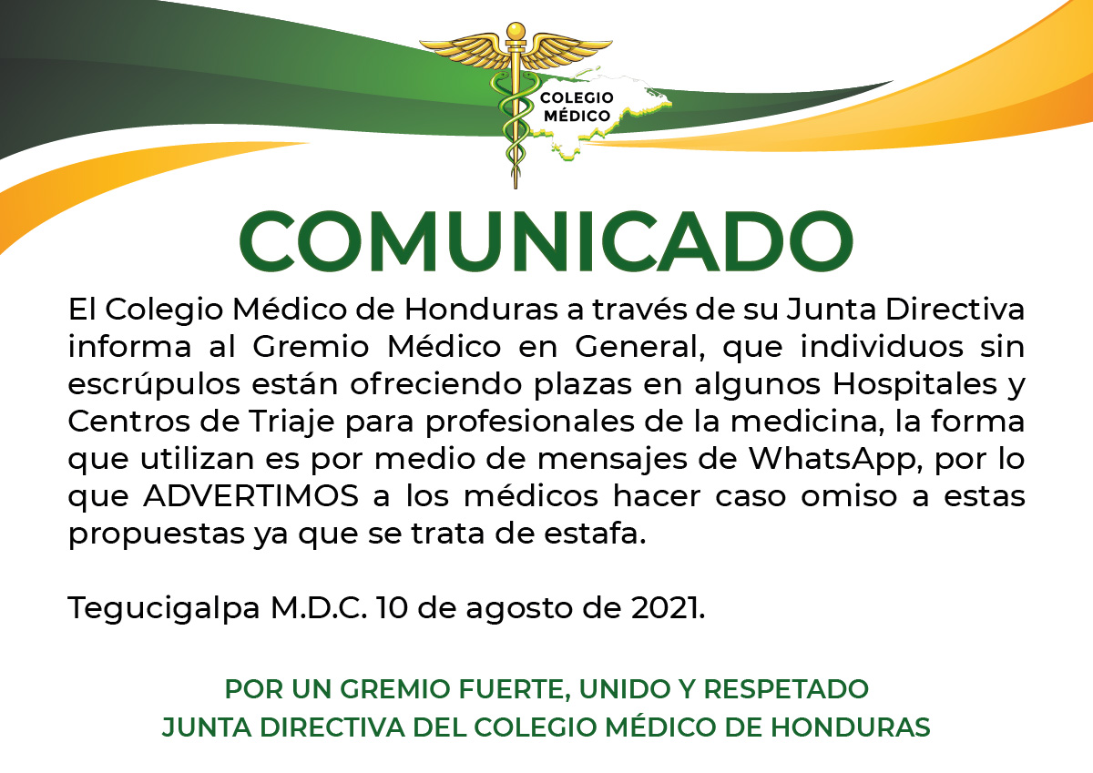 El Colegio Médico de Honduras a través de su Junta Directiva informa al Gremio Médico en General, que individuos sin