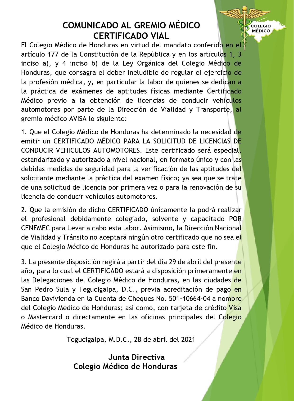 COMUNICADO AL GREMIO MÉDICO - CERTIFICADO VIAL