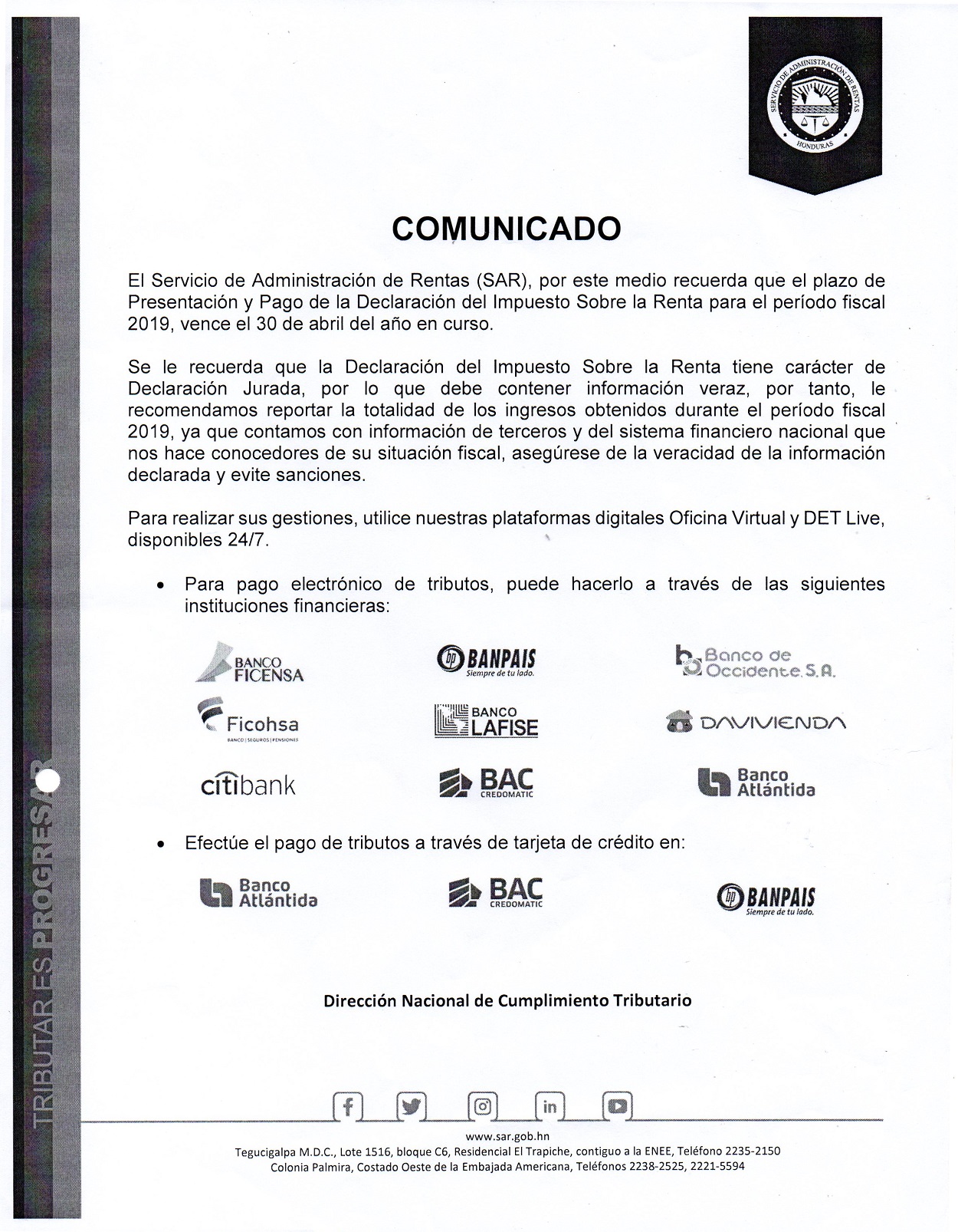 COMUNICADO del Servicio de Administración de Rentas (SAR)