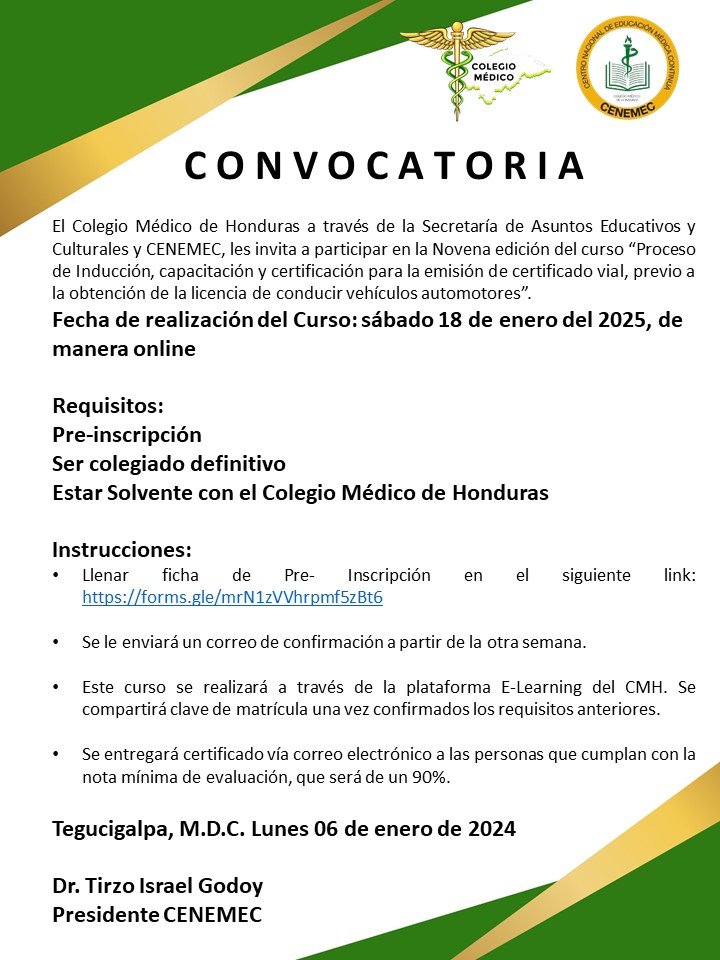El Colegio Médico de Honduras a través de la Secretaría de Asuntos Educativos y Culturales y CENEMEC, les invita a participar en la Novena edición del curso “Proceso de Inducción, capacitación y certificación para la emisión de certificado vial, previo a la obtención de la licencia de conducir vehículos automotores”.