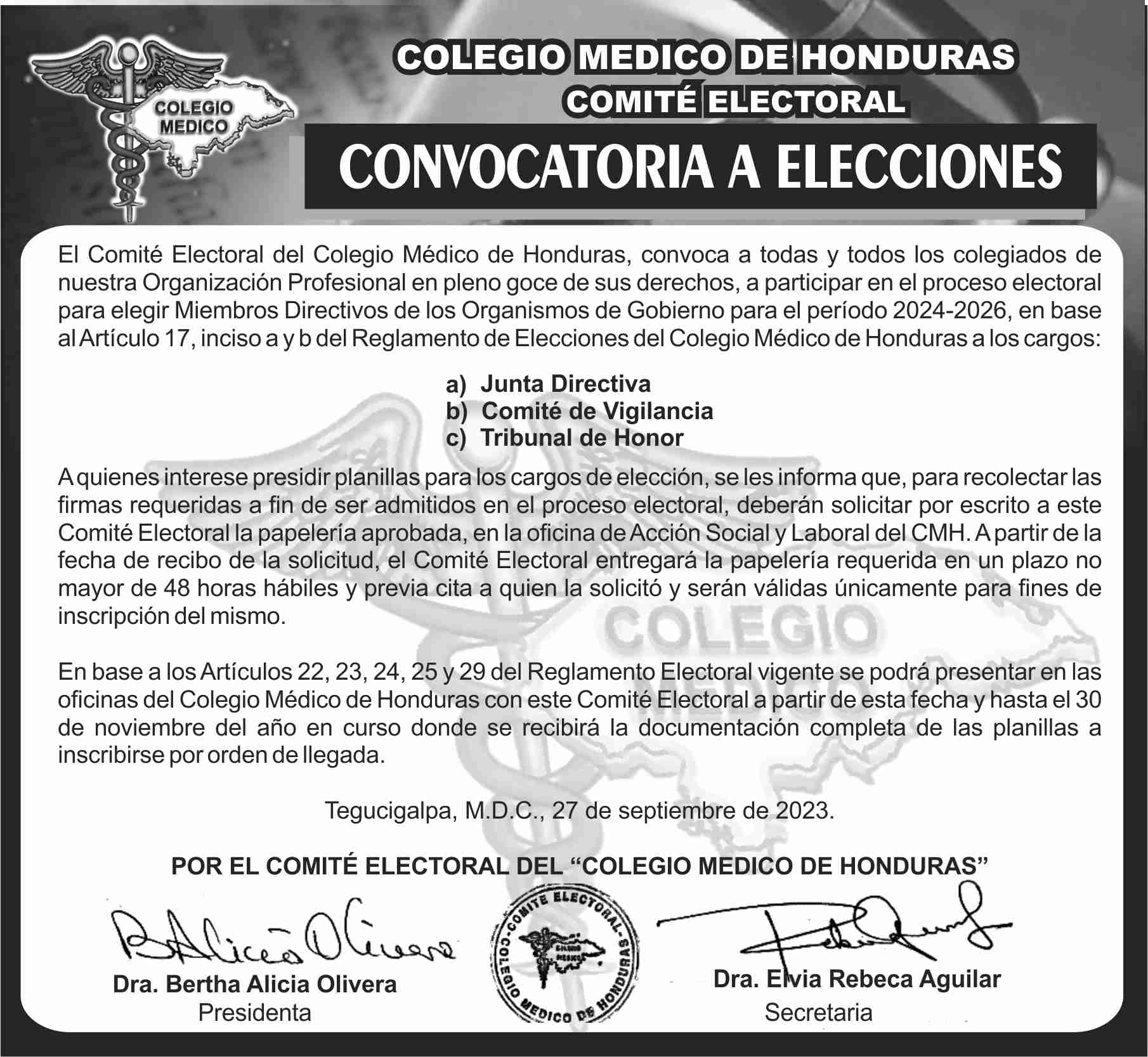 El Comité Electoral del Colegio Médico de Honduras, convoca a todas y todos los colegiados de nuestra Organización Profesional en pleno goce de sus derechos, a participar en el proceso electoral para elegir Miembros Directivos de los Organismos de Gobierno para el período 2024-2026, en base al Artículo 17, inciso a y b del Reglamento de Elecciones del Colegio Médico de Honduras a los cargos: