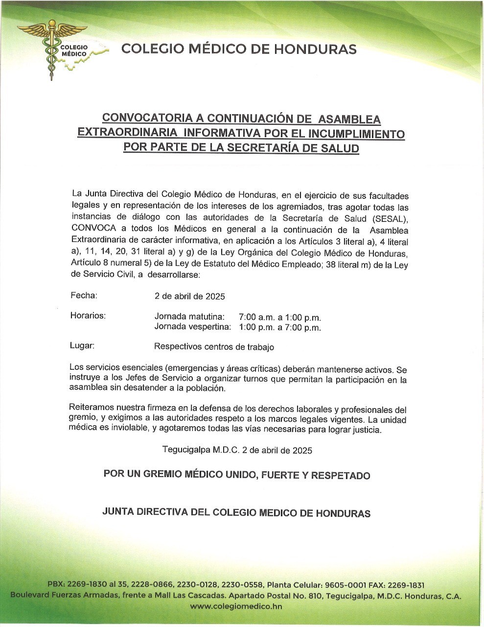 CONVOCATORIA ASAMBLEA EXTRAORDINARIA INFORMATIVA POR EL INCUMPLIMIENTO POR PARTE DE LA SECRETARIA DE SALUD - FECHA: 2 DE ABRIL DE 2025