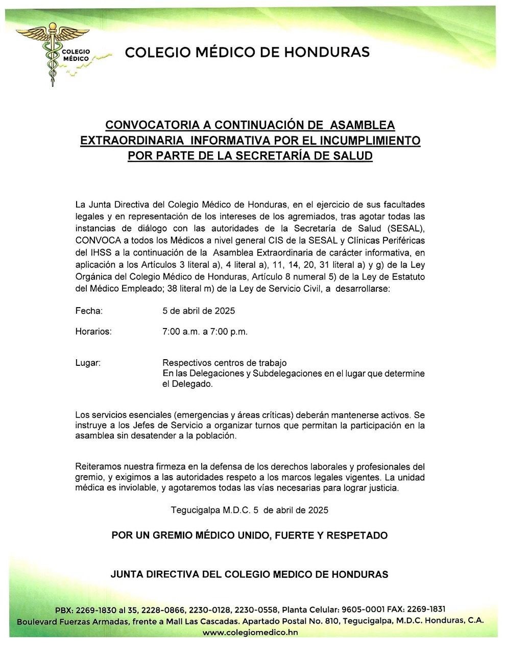 CONVOCATORIA ASAMBLEA EXTRAORDINARIA INFORMATIVA POR EL INCUMPLIMIENTO POR PARTE DE LA SECRETARIA DE SALUD - FECHA: 5 DE ABRIL DEL 2025