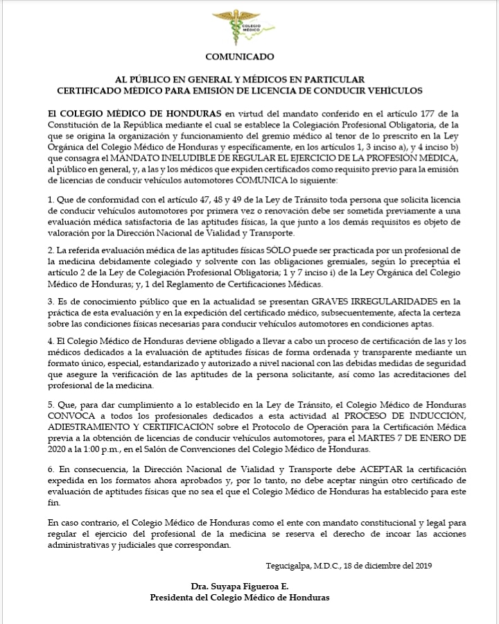 El COLEGIO MÉDICO DE HONDURAS en virtud del mandato conferido en el artículo 177 de la Constitución de la República mediante el cual se establece la Colegiación Profesional Obligatoria, de la que se origina la organización y funcionamiento del gremio médico al tenor de lo prescrito en la Ley Orgánica del Colegio Médico de Honduras y específicamente, en los artículos 1, 3 inciso a), y 4 inciso b) que consagra el MANDATO INELUDIBLE DE REGULAR EL EJERCICIO DE LA PROFESIÓN MÉDICA, al público en general, y, a las y los médicos que expiden certificados como requisito previo para la emisión de licencias de conducir vehículos automotores COMUNICA lo siguiente: