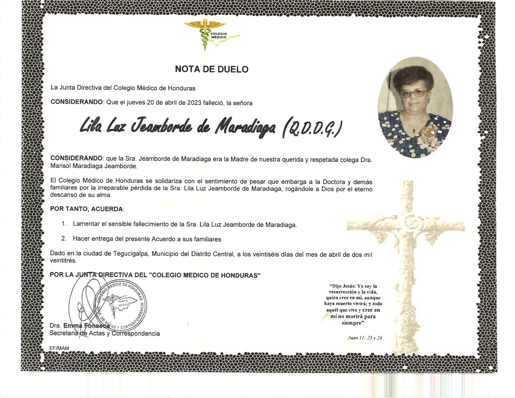 Nota de Duelo Madre de Dra. Marisol Maradiaga Jeamborde