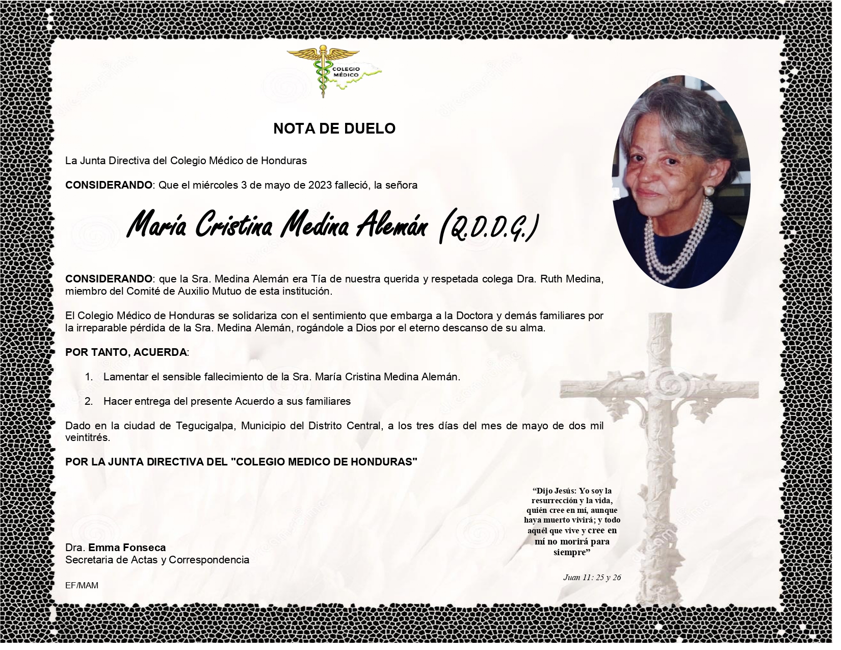 Nota de Duelo tía de Dra. Ruth Medina