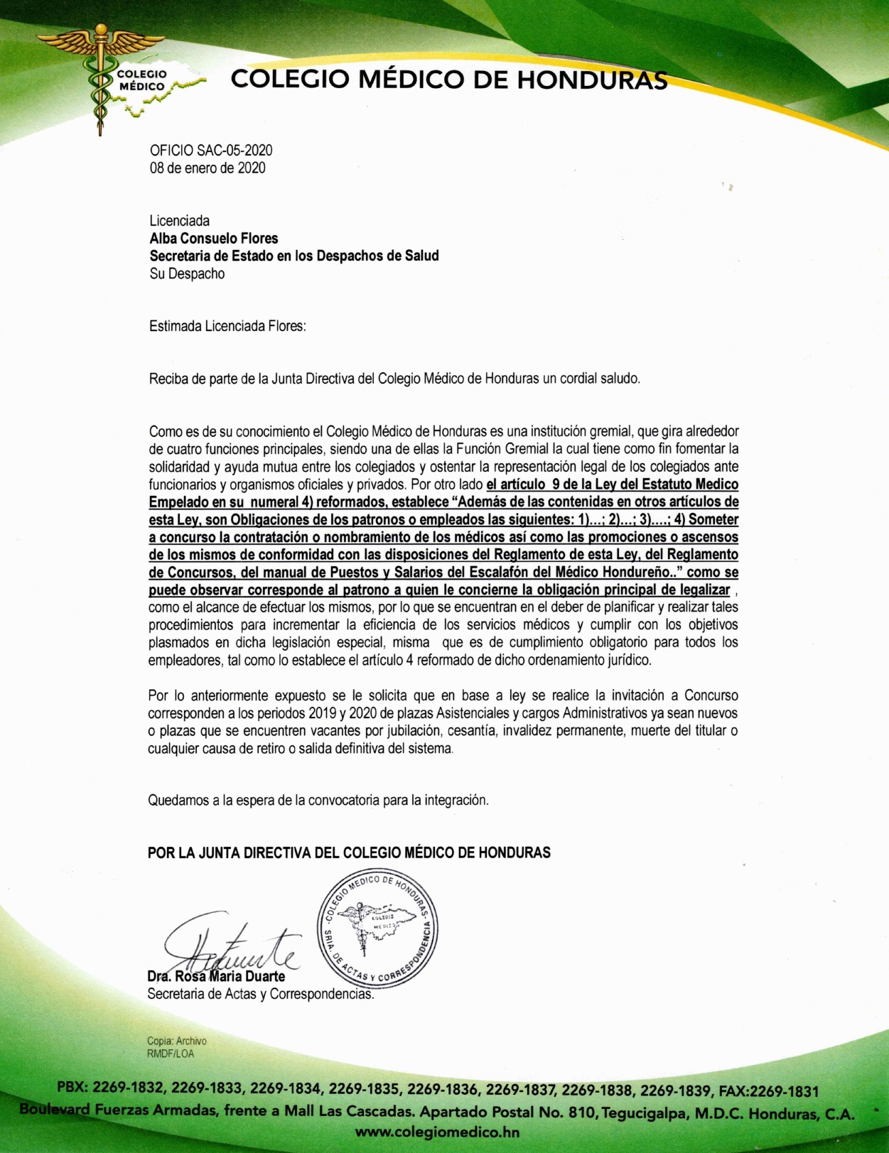 Dirigido a la Licenciada Alba Consuelo Flores, Secretaria de Estado en los Despachos de Salud